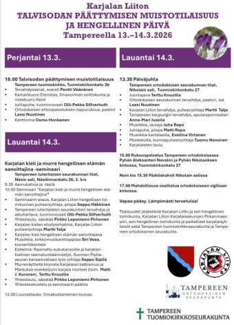 Tilaisuuksien järjestäjät: Karjalan Liitto ja sen hengellinen toimikunta, Karjalaisseurojen Pirkanmaan piiri, paikalliset karjalaisyhteisöt sekä Tampereen tuomiokirkkoseurakunta ja Tampereen ortodoksinen seurakunta. Vapaa pääsy. Lämpimästi tervetuloa