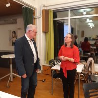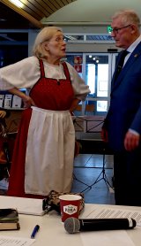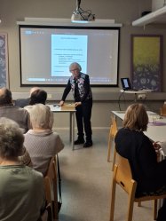 Paljasjalkamummo Hannele Raejärvi kertoi syyskokouksessamme 8.11.2023 karjalaisista juuristaan ja järvenpääläisyydestään. Lasse Savolainen ojentaa sukkaset kiitokseksi. Kuva Markku Ronkainen.