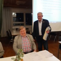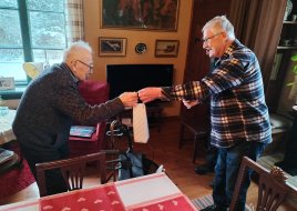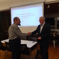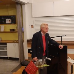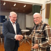 Kuva Pekka Kärnästä 7.4.2022. Järvenpään Karjala Seura onnitteli häntä 2021 myönnetystä Karjalan Liiton kultaisesta ansiomerkistä.