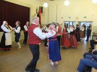 Järvenpään kansantanssijat tanssivat harmonikan säestyksellä viisi kansantanssia.
