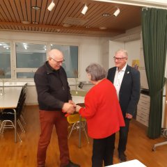 Anneli Suniala saa KL:n hopeisen ansiomerkin, Arvi Kekäläinen ja Lothar Mallon saavat harrastusmerkin ja kokouksen pj Ari Åberg sukkaset Lasse Savolaiselta.