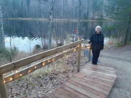 Sirkka-Liisa Oikari esitteli Juupajoen uutta avantouintipaikkaa Heimolan rannassa. Saunalta laiturin päähän ulottuva kaide ja liukastumista estävä matto on hankittu POKO ry:n myöntämän Älyä, eloa, iloa -teemahankkeen tuella. Kuva Jutta Ahro