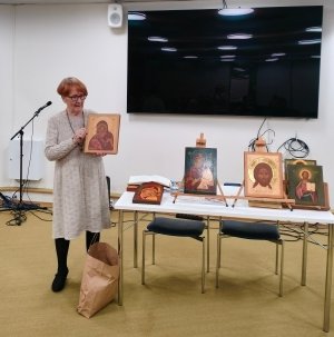 Esitys avasi uusia näkymiä ikonien maailmaan. Eija kertoi, että ikoneita voi lähestyä eri tavoin: järjen tai sydämen kautta. Ikonilla on monta merkitystä. Tänään ikonit ja niiden maalaaminen kiinnostaa myös luterilaisia. Esityksessä Eija kertoi mm. liinaikonin taustasta, evakkoikonista ja jouluikonista.