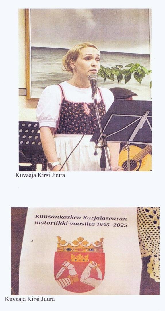 Ylärivin kuvissa, Kuusankosken uudella hautausmaalla Karjalaan jääneiden vainajien muistomerkillä 2018, Kansallispukunäyttely kesäjuhlilta 2013, Seuran kesäretkellä Heinäveden Valamossa 20.8.2013, Pääsiäsmyyjäiset S-Marketin Kuusantorin aulassa 22.3.2018. Alarivin kuvissa seuramme jäseniä marssimassa Kuusankosken-Karjalaseuran kulkueessa, karjalaisten kesäjuhlassa Hämeenlinnassa 2019, ja tarinakerhon osallistujia Seurakuntalossa. Kesäisiä kuvia Kontlammen saunaillasta. Kymenlaakson piirin kulttuuripäivä Orilammella 18.8.2019. Aiheena Talvisodan henki ja Raatteentie - myytinmurtaja, näkökulmia sotahistoriaan by Teemu Keskisarja.