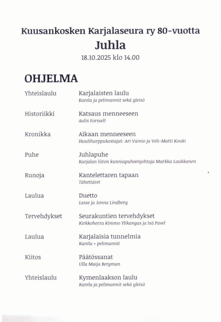 Seuramme 80-vuotistaival huipentui juhlaan Kuusankosken seurakuntakeskuksessa 18.10.2025. Alimpana kuvia 80-vuotisjuhlastamme. Juhla aloitettiin yhteislaululla laulamalla "Karjalaisten laulu", jonka jälkeen piti Isä Pavel Kouvolan ortodoksieurakunnasta puheen.
