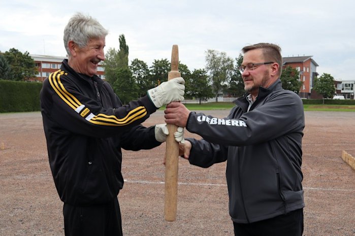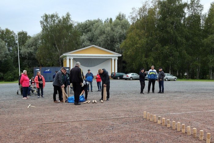 Pelikenttä on valmis ja käteen sopivia karttuja eli kyykkämailoja valitaan. Taustalla hiljattain kunnostettu laululava.