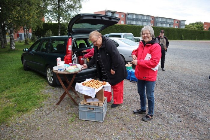 Maileena kahvipisteellä, johon Merja Evala, kuvassa oikealla, oli leiponut uunituoreet maistuvat pullat.