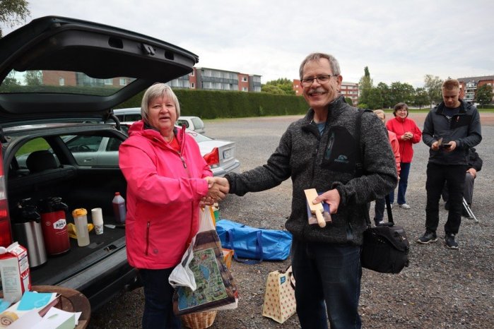 Seurojen puheenjohtajien kättely. Sirpa onnittelee Esaa ja ojentaa tälle palkinnoksi Aimo Äikiän tekemän katajaisen paistinlastan ja suklaalevyn.