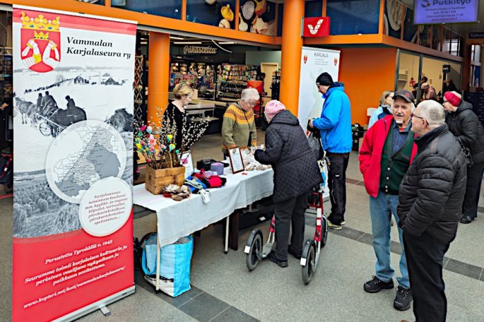 Vammalan Karjalaseuran perinteinen toritapahtuma Torikeskus Sastamalan aulassa 28.3.2026 klo 9 alkaen. Luvassa mm. virvontaa ja myynnissä mm. karjalanpiirakoita, leivonnaisia ja villasukkia. Piirakat on tehty edellispäivän talkoissa.
