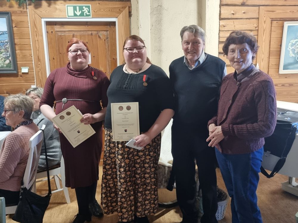 Syyskokuksessa piirin puheenjohtaja Jorma Lind ja varapuheenjohtaja Terttu Knuutila luovuttivat kaksi piirin ansiomerkkiä piirin hyväksi tehdystä ansiokkaasta työstä. 115. mitalin sai Riina Isosaari (vas.) ja 116. mitalin sai Reija Isosaari. Valokuva: Aila-Liisa Laurila