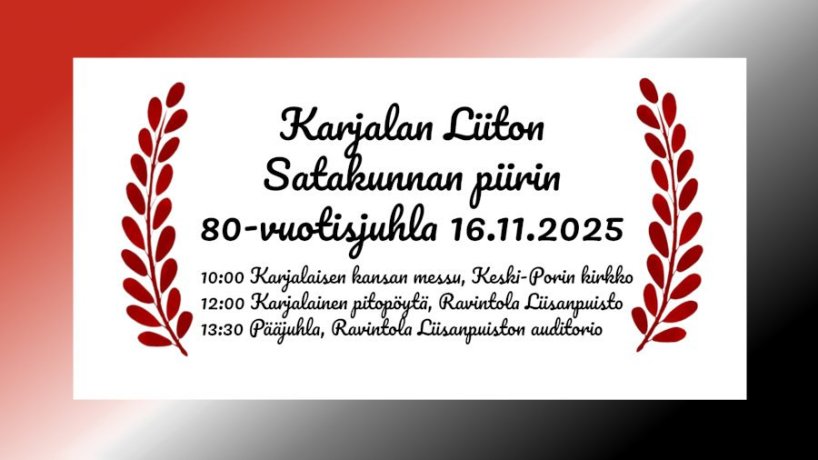Karjalan Liiton Satakunnan piiri viettää 80-vuotisjuhlaansa Porissa sunnuntaina 16.11.2025. Juhlallisuudet alkavat Karjalaisella kansan messulla Keski-Porin kirkossa klo 10. Messun jälkeen on seppeleiden lasku muistomerkeillä.