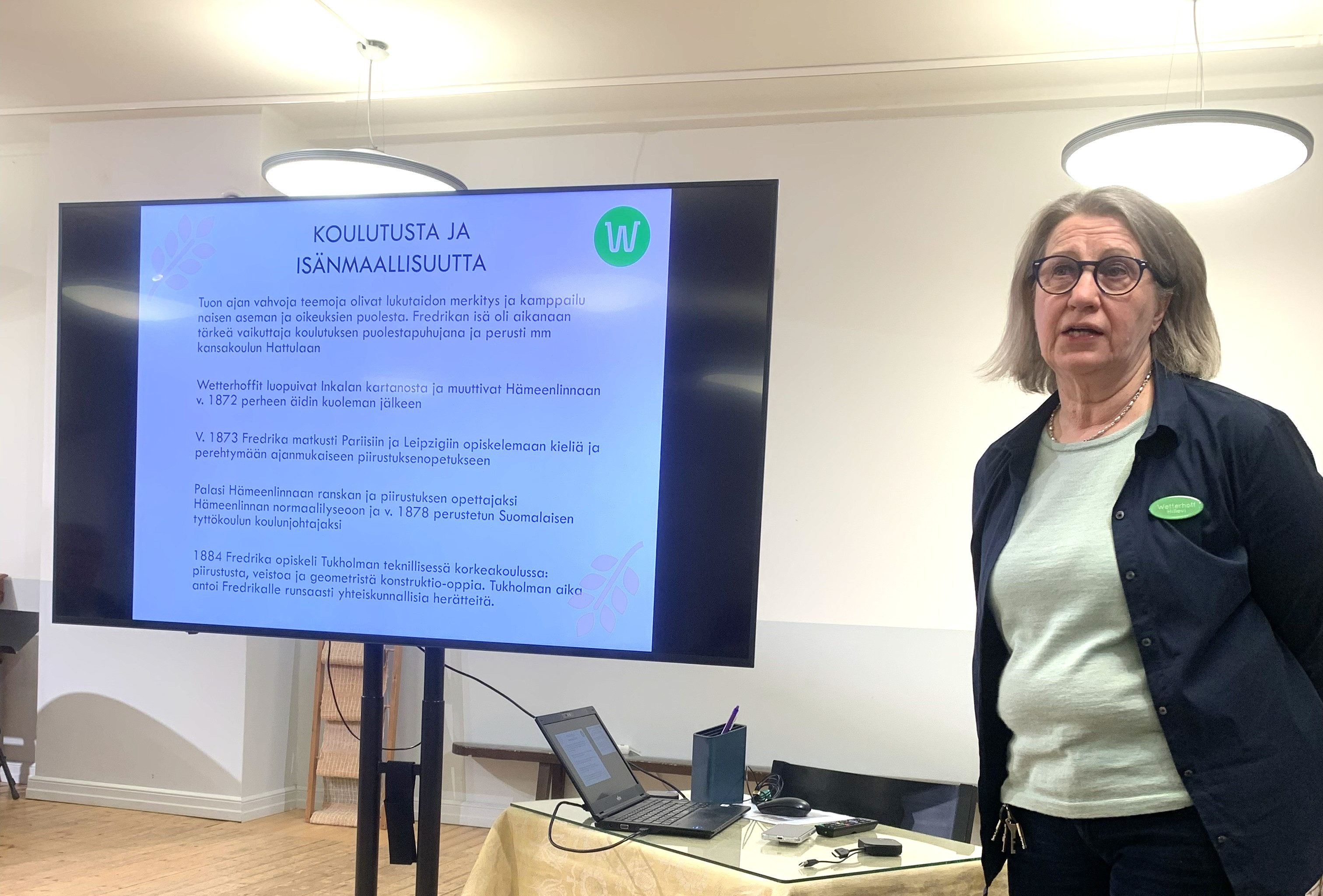 Wetterhoff-säätiön toiminnanjohtaja Hillevi Kaarlenkaski kertoi talon historiasta ja erityisesti Fredrika Wetterhoffista, joka oli säätyläisperheeseen vuonna 1844 syntynyt tytär. Sen ajan tavan mukaan hän sai kasvatusta kielten oppimisessa ja käsitöissä ja täydensi myöhemmin koulutustaan ulkomailla mm. ranskaa, saksaa ja piirustusta opiskellen.