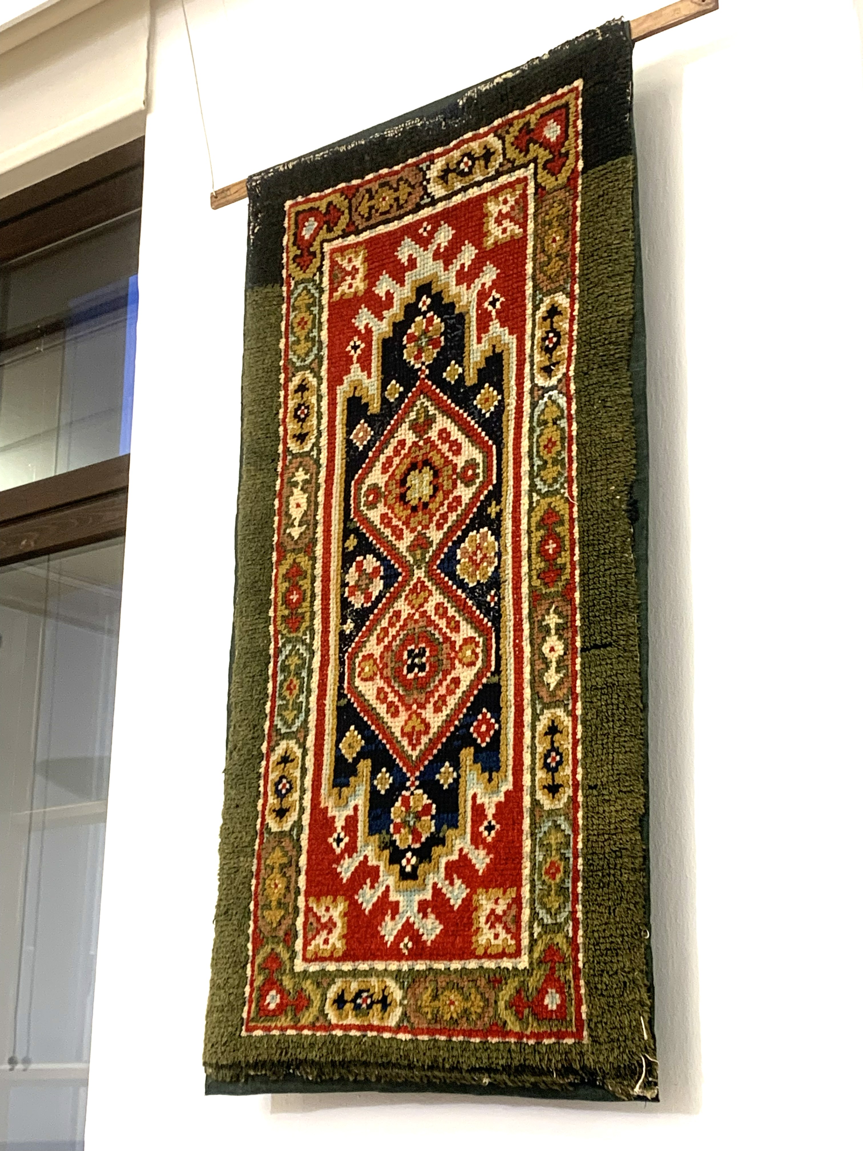 Kokoushuoneen seinällä oli useita Wetterhoffin ryijyjä, mm. tämä 1891 tehty ryijy.