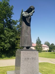 Karjalan itkuvirsi -patsas sijaitsee kirkkopuistossa.