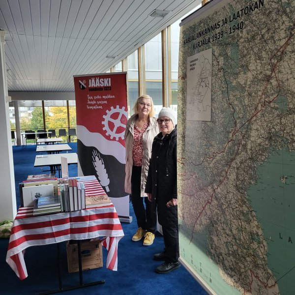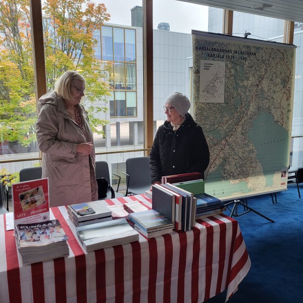 Olimme saaneet Karjalan Liitolta lainaksi osastolle Karjalan kartan, johon kävijät voivat merkitä sukunsa asuinpaikkoja Karjalassa. Merkintöjä kertyi Lavansaaresta Salmiin ja Suolahteen asti. Jääski-juurisia oli paljon liikkeellä, samoin ihmisiä Kannaksen eri pitäjistä. Kartta oli vetonaula, jonka ympärillä riitti väkeä koko tapahtuman ajan. Jääski-seuran osastolla päivystäneet Leena Vänskä ja Heljä Parkko kuulivat monet muistelut kartan ääressä.
