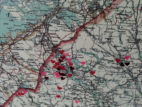 Moni Suhinoiden kävijä merkkasi Karjalan karttaan oman sukunsa asuinpaikkoja.