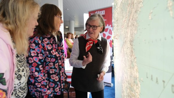 Pääkuva: Leena Vänskä jututtaa kävijöitä Karjalan kartan ääressä. Kuva: Kouvolan kaupunki