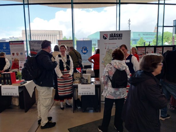 Kuva: Pitäjä- ja sukuseurat olivat aktiivisesti mukana Oodi Karjalassa -tapahtumassa kesäkuussa 2025. Osastoilla riitti kyselijöitä ruuhkaksi asti. Tule tapaamaan pitäjien edustajien pitäjä- ja sukumarkkinoille Karjalatalolle pitäjä- ja sukumarkkinoille. Kuva Sofia Flygare.