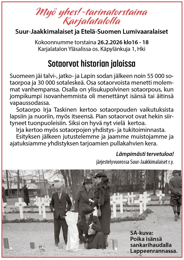 Suur-Jaakkimalaiset ovat jo vuoden ajan järjestäneet eri aiheita käsitteleviä tarinatorstaita yhdessä Lumivaaralaisten kanssa. Jatkamme näiden iltojen järjestämistä myös tänä vuonna. Seuraava tarinatorstai on 26.2. klo 16, jolloin aiheena on "Sotaorvot historian jaloissa". Sotaorpo, hallituksemme entinen jäsen Irja Taskinen kertoo sotaorpouden vaikutuksista lapsiin ja nuoriin, myös itseensä.