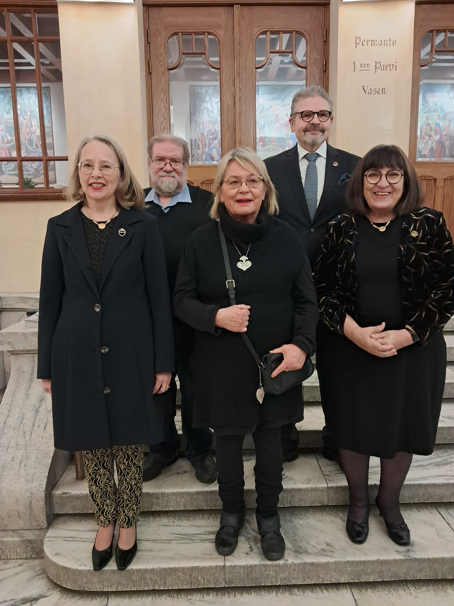 Suur-Jaakkimalaiset ry:n hallitus 2026 Edessä vasemmalla Riikka Levonen, Kirsti Hartikainen ja Tarja Rantama. Ylhäällä vasemmalla Jyrki Tiittanen ja vieressä Pertti Parikka