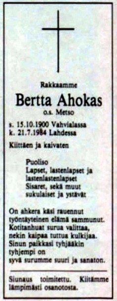 Ahokas Bertha, os. Metso, ent. Messo (Tervajärvi, Mättö)