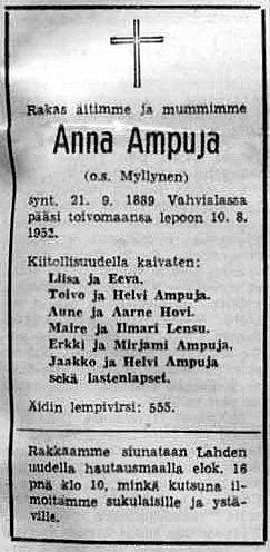 Ampuja Anna, os. Myllynen (Tervajärvi Myllynen /Vanhakylä Ampuja)