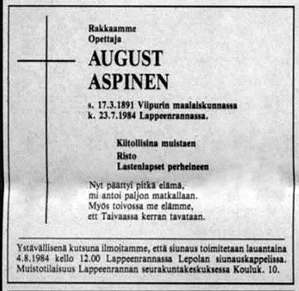 Aspinen August, opettaja (Vanhakylä Kauppila)