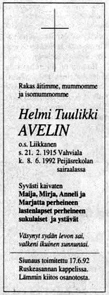 Avelin Helmi, os. Liikkanen (Vanhakylä Kauppila)
