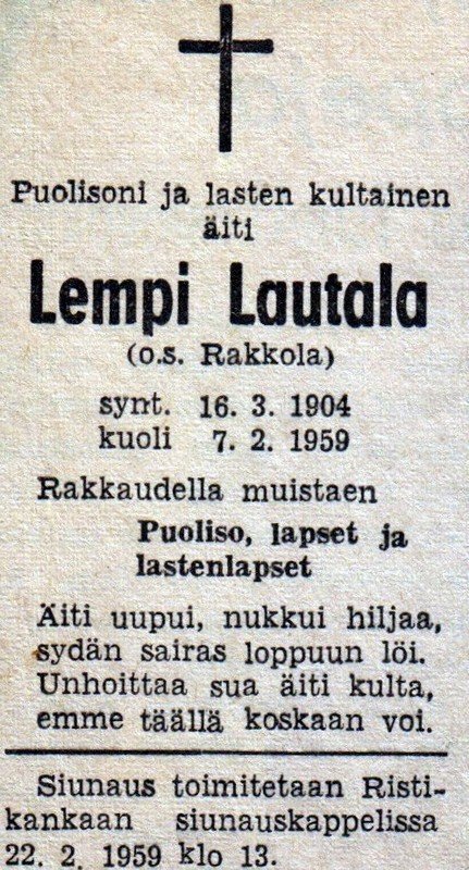Lautala Miina, os. Rakkola (Vahviala kk Sipilä /Nurmi)