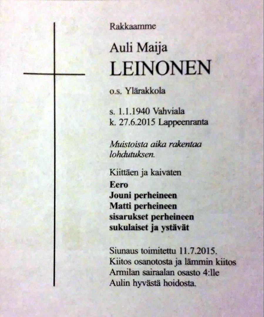 Leinonen Auli Maija, os. Ylärakkola (Vahviala)