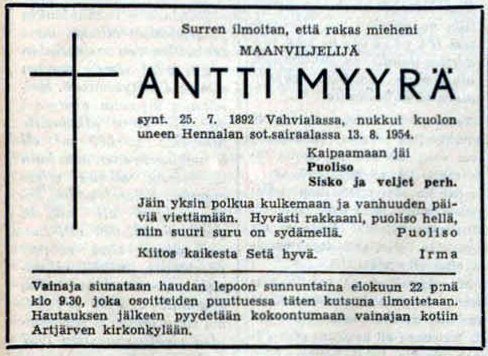 Kestuvan isäntä Heikki Myyrä (1866-1943) kuoli Hounilla lokakuussa 1943. Koska oma kotitalo oli sodassa tuhottu, muistotilaisuus järjestettiin Lensun talossa, Kivikko 36.