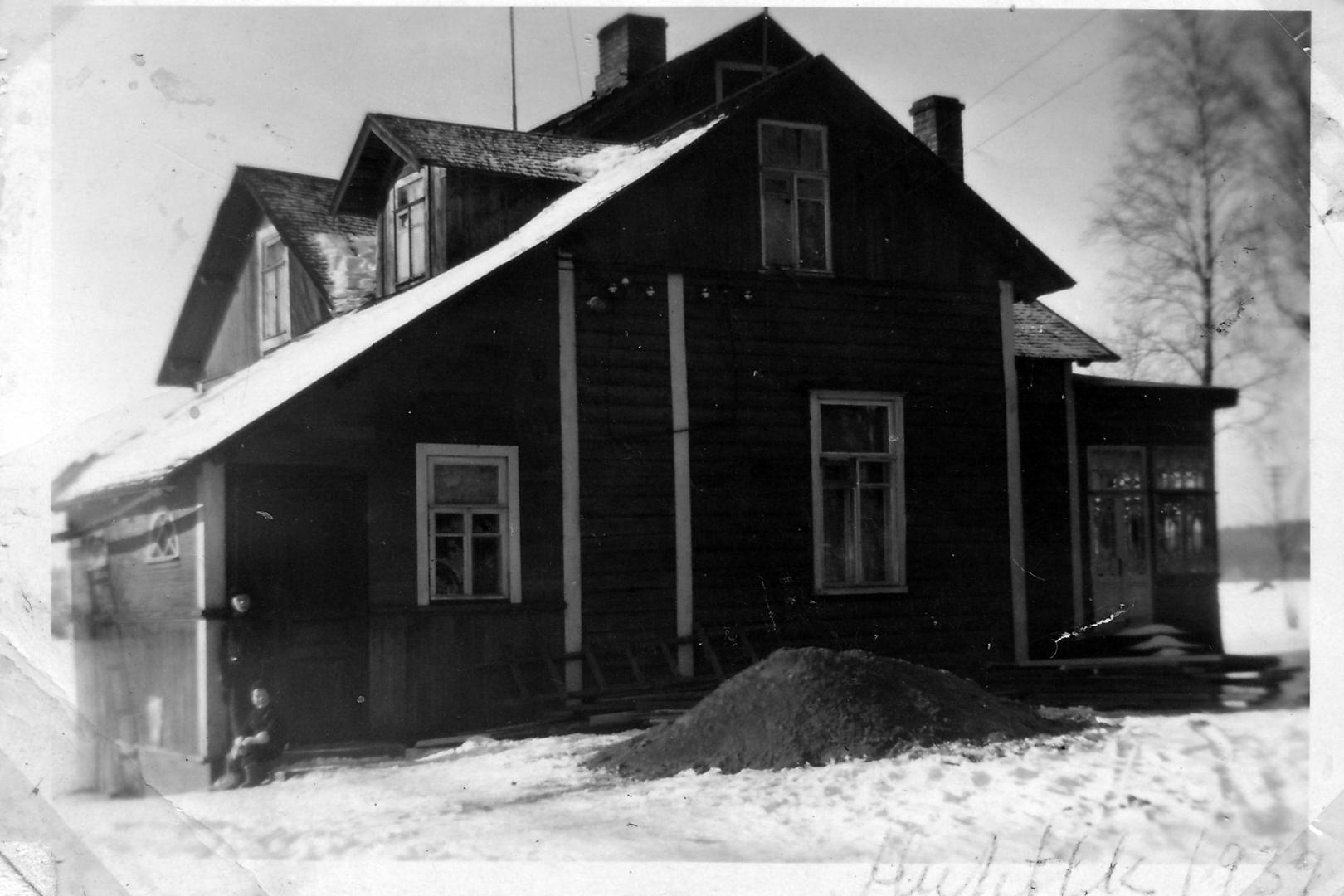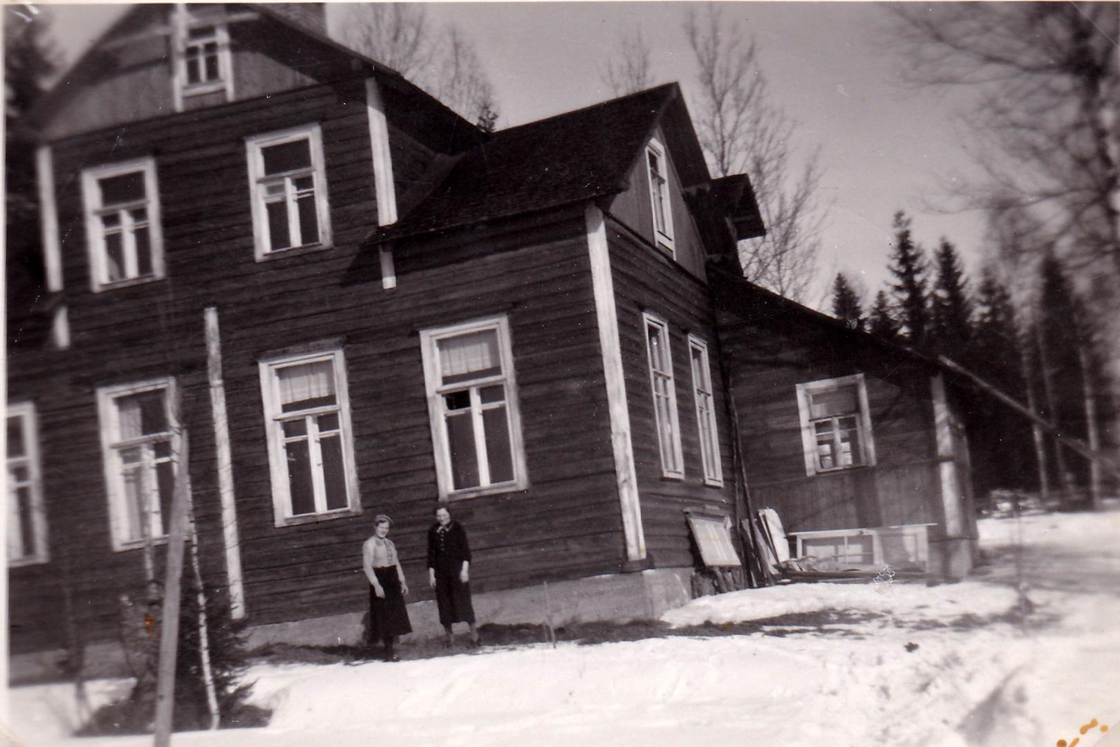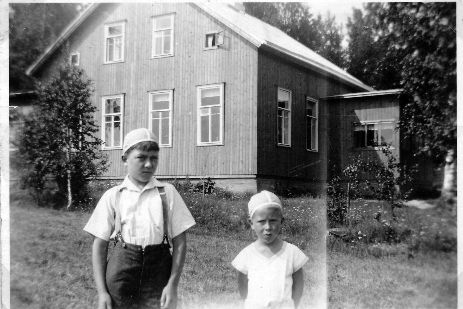 Mäkelän päärakennus täydellisen remontin läpikäyneenä. Kuvassa Toivo Piirosen lapset vas Ilmari ja Paavo. Hanhijoen Mäkelä 1939 (Ilmari Piironen)