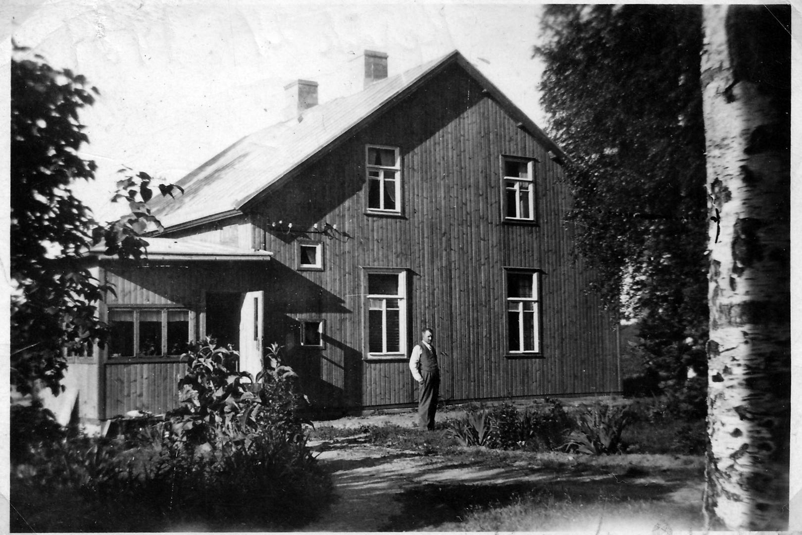 Mäkelän päärakennus remontin jälkeen kartanon puolelta kuvattuna,talon edessä isäntä Toivo Piironen. Hanhijoen Mäkelä 1939 (Ilmari Piironen)