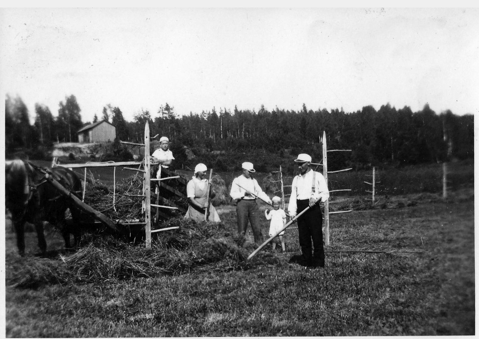 Mäkelän talon väkeä korjaamassa kuivaa heinää seipäiltä. Ilmari-poika ajaa hevosta ja talloo kasan päällä kuivaa heinää tiiviimmin heinäkärryille, Olga-äiti ja oik Toivo-isä sekä Hounin Heikki tekee kuormaa, pikkuveli Paavo toimii kuormaajien apulaisena. Hanhijoen Mäkelä (Ilmari Piironen)
