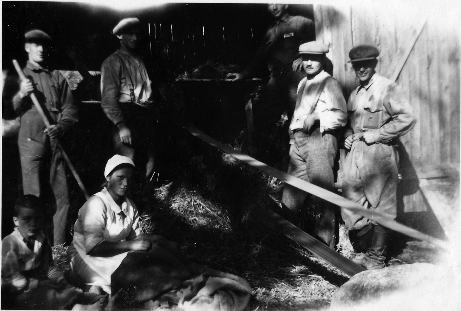 Mäkelän talon väkeä puintihommissa tilan puimalassa. Edessä istumassa vas Ilmari Piironen ja Olga-äiti, takana seisomassa vas tuntematon, Heikki Houni, puimalan siäpuolella isäntä Toivo Piironen ja oik kaksi tuntematonta. Hanhijoen Mäkelä 1939 (Ilmari Piironen)