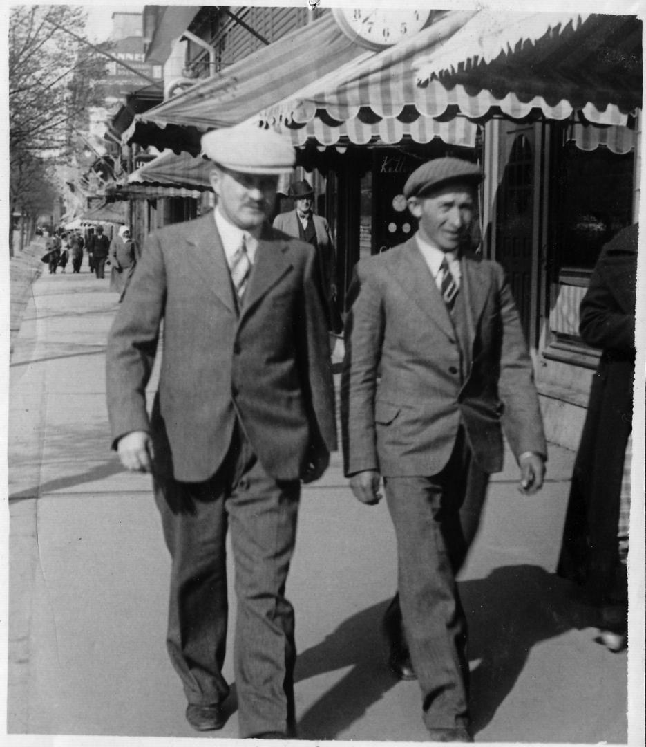 Hanhijoen Mäkelän tilan omistaja Toivo Piironen (vas) Viipurissa Torkkelin kadulla tilan pehtoorin Eino Nevalaisen kanssa. Viipuri 1939 (Ilmari Piironen)