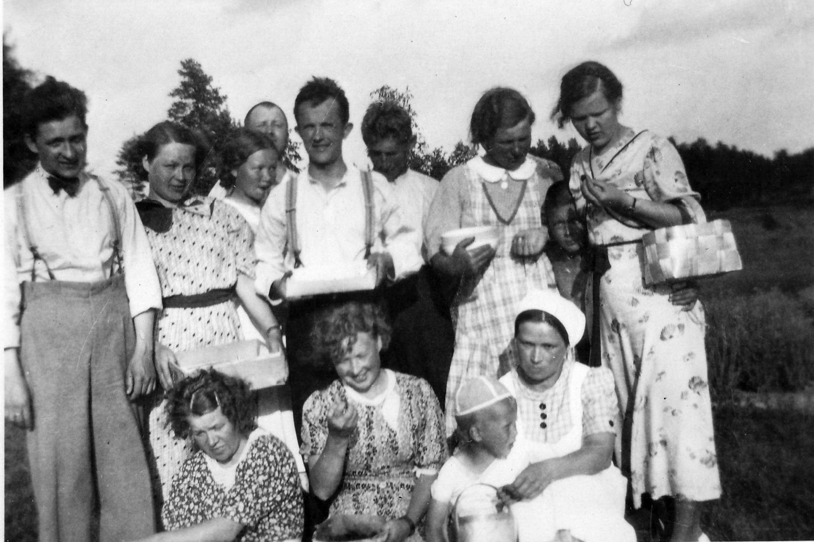Toivo Piironen totesi, että metsämansikkasato on mainio ja kokosi koko kaupan henkilökunnan marjankeruutalkoisiin, ehkäpä vaikka kauppaan myytäväksi asti, hyvä marjasaalis saatiinkin. Poimintaretken jälkeenToivo lupasi kuitenkin poimijoille heidän poimimat marjat kullekin omaksi. Edessä oik Olga Piironen Paavo-poikansa kanssa, Ilmari kurkistaa kahden oikeanpuoleisen naishenkilön välistä, Toivo Piironen seisoo keskellä. Hanhijoki 1939 (Ilmari Piironen)
