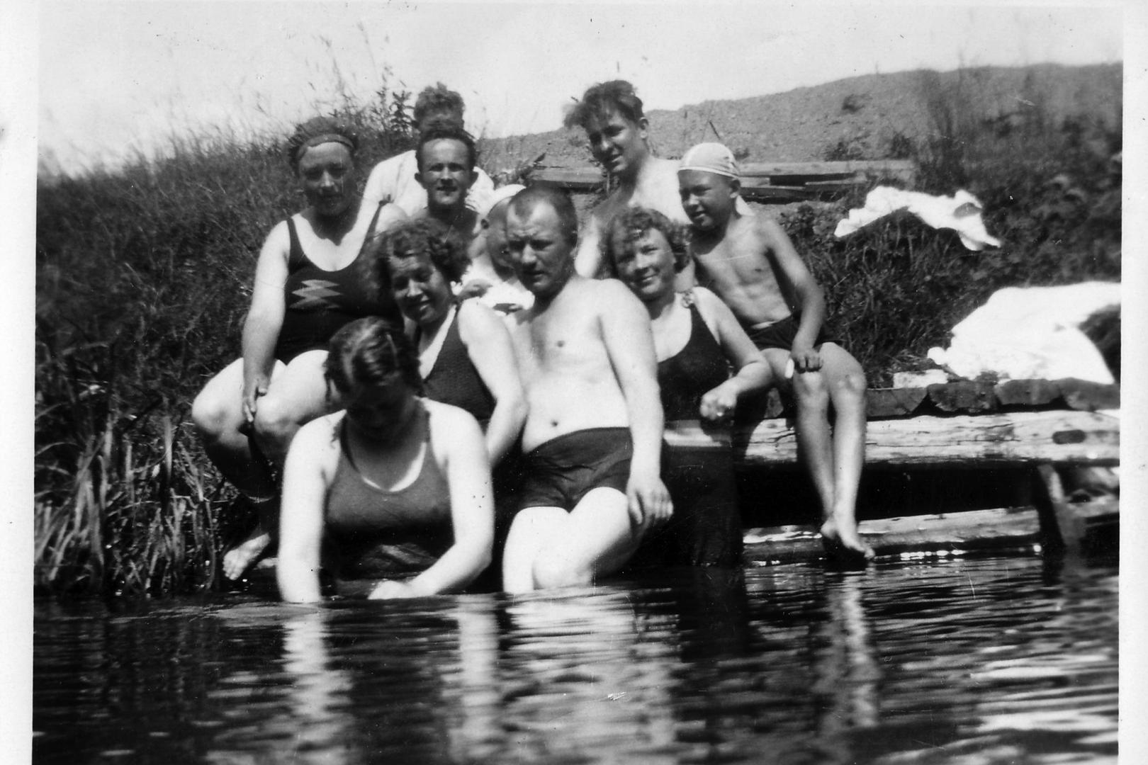 Toivo Piirosen järjestämän mansikkaretken jälkeen poimijat tekivät päivän päätteeksi uintiretken Hanhijoen varteen. Äärimmäisenä oik Ilmari Piironen, keskellä istuu Toivo Piironen Paavo-poikansa kanssa. Hanhijoki 1939 (Ilmari Piironen)