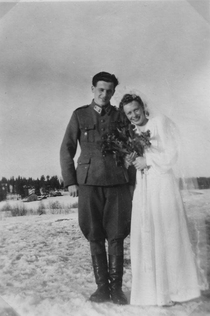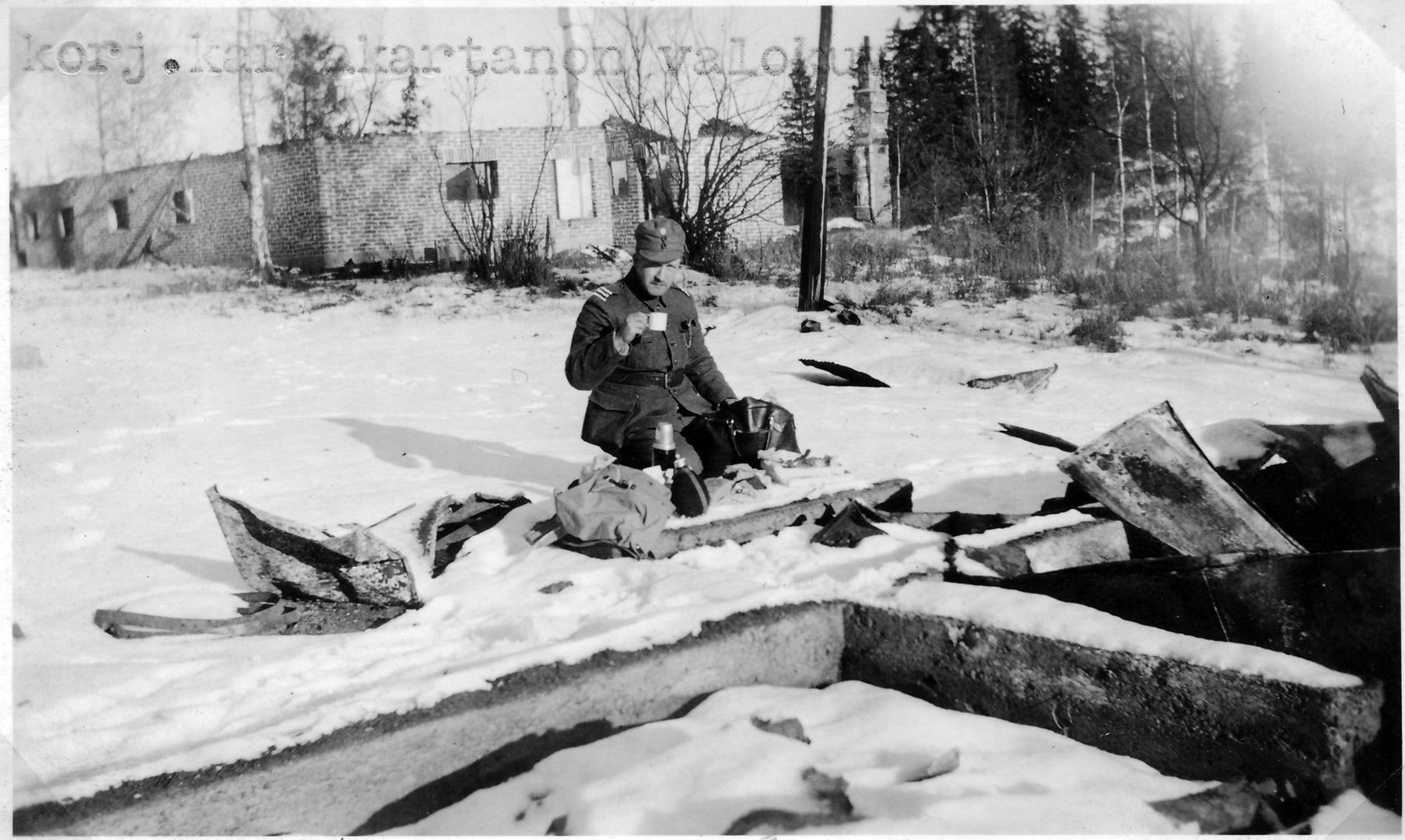 Mäkelän talon raunioilla isäntä kersantti Toivo Piironen. Taustalla palaneen navetan muurattu alaosa ja .... Hanhijoen Mäkelä 1942 (Ilmari Piironen)