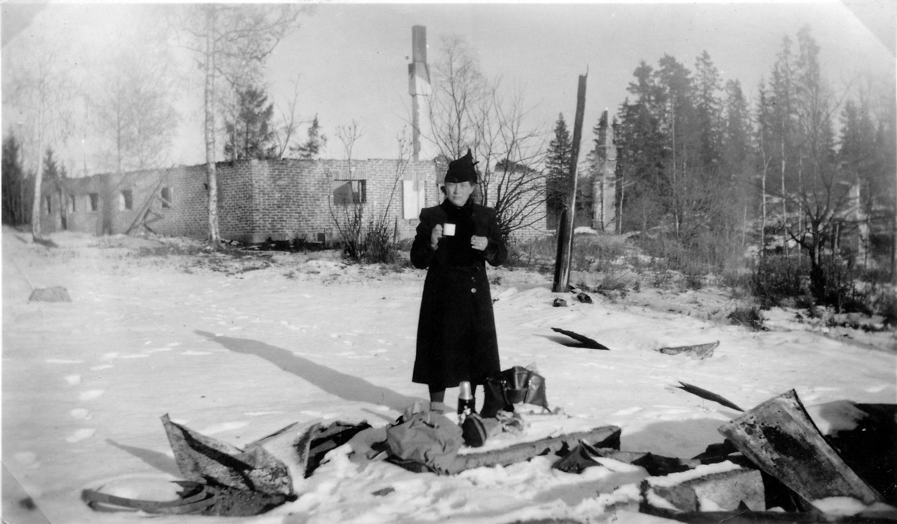 Mäkelän tilan päärakennuksen rauniot kevättalvella 1942 kun päästiin takaisin kotiseudulle. Hanhijoen Mäkelä 1942 (Ilmari Piironen)