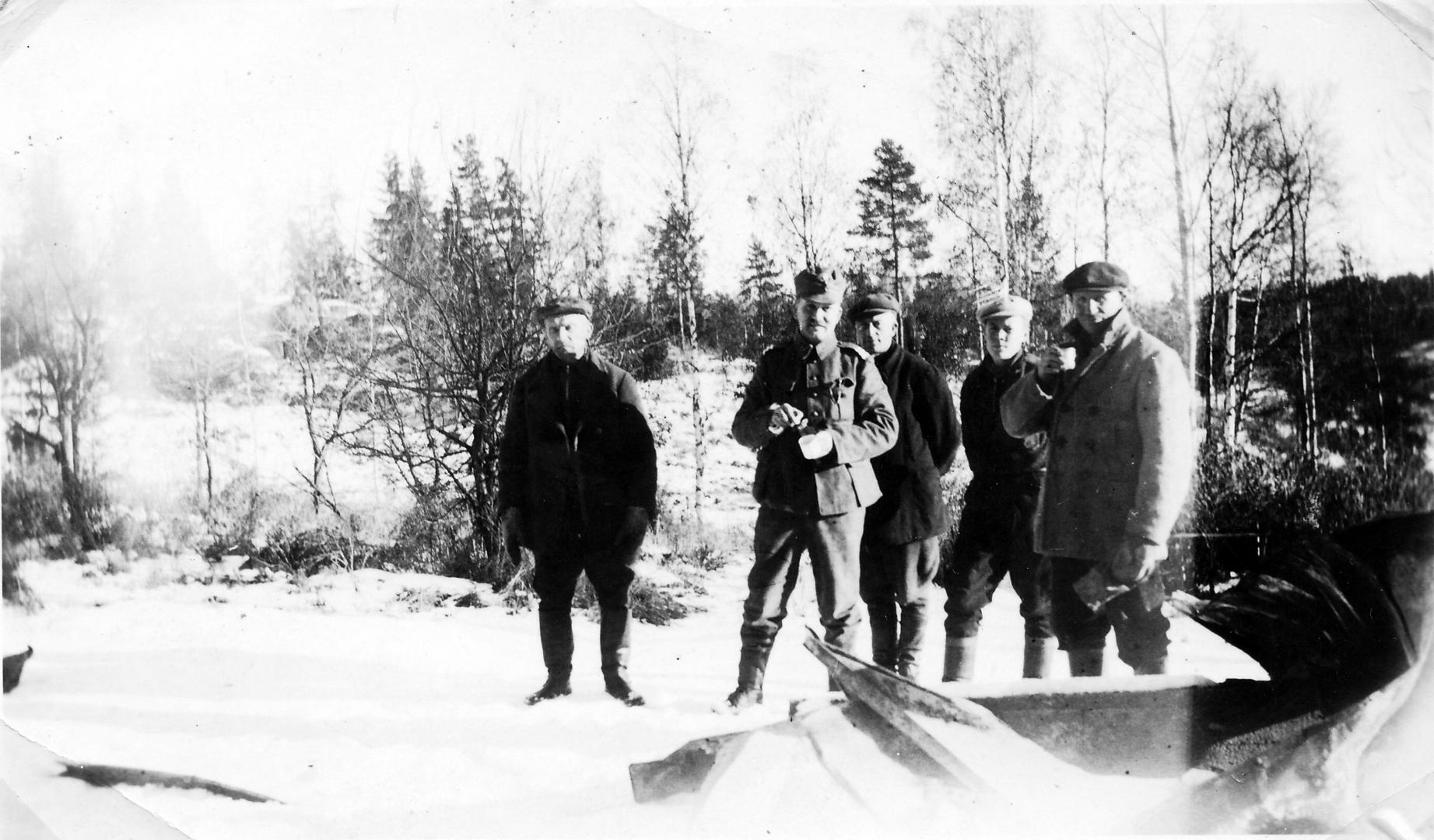 Paluun jälkeen keväällä 1942 alkoi jälleenrakennussuunnittelu. Kuvassa sotilaspuvussa isäntä Toivo Piironen, äärimmäisenä oikealla naapuritilan (Hovi) omistaja Heikki Houni ja hänestä vasemmalla Veikko Karhu. Toivo Piironen menehtyi jäätyään takaa tulevan auton alle Mäkelän ja Hovin talojen välissä päätiellä olevalla "Murikka sillalla". Alkuperäinen silta oli yksiholvinen kivisilta, joka oli sotatoimien aikana tuhoutunut ja nyt paikalla oli kapea puusilta. Hanhijoen Mäkelä 1942 (Ilmari Piironen)