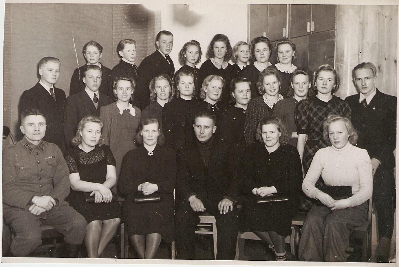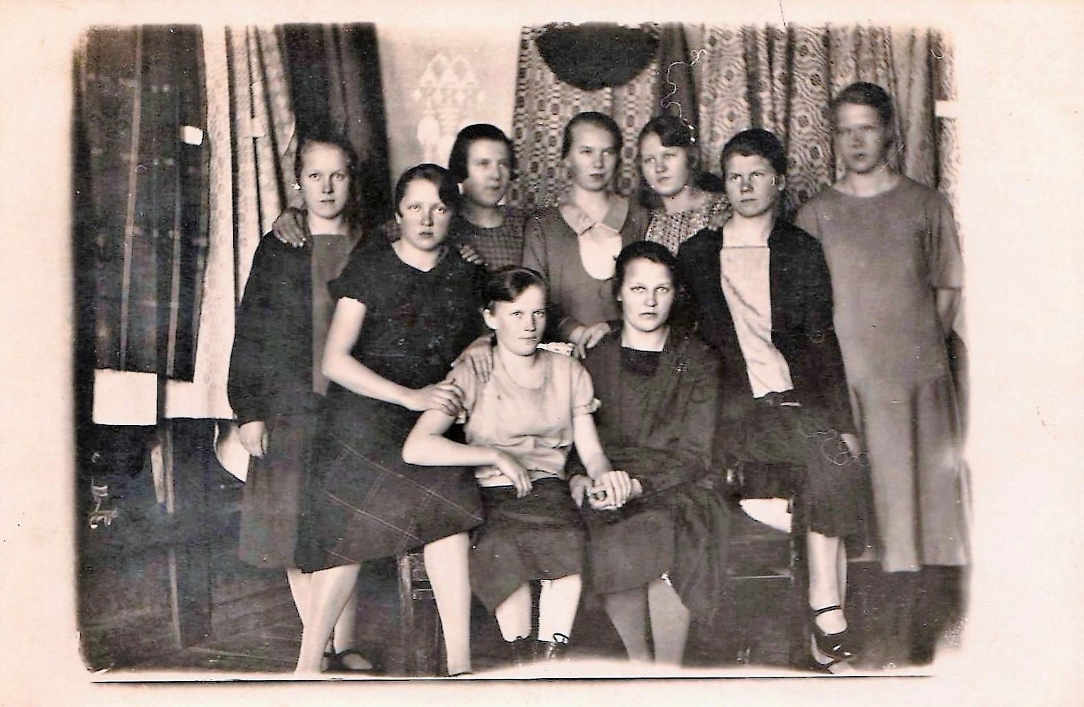 Kutomakurssilla mukana ainakin: 6. Lydia Venäläinen Korpelasta, 10. Elma Meijer Ukonjärven Koivulasta (47), 12. Laila Houni Koivulasta (1) läheltä Louon rajaa. Hounin kansakoulu 1936 (Sisko Dunderfelt)