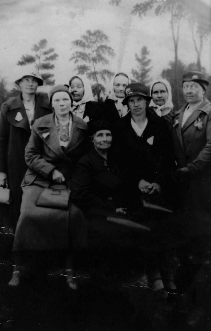 Hounin ja Louon Marttayhdistyksen kutomakurssin osanottajia. Oikealla Anttilan Hilja Houni (25), Sikosaaren Hilja Houni (8) ja viidentenä Virtalan Kerttu Messo (2). Muut Louolta. Hounilla 1920- luvun lopulla (Matti Venäläinen)