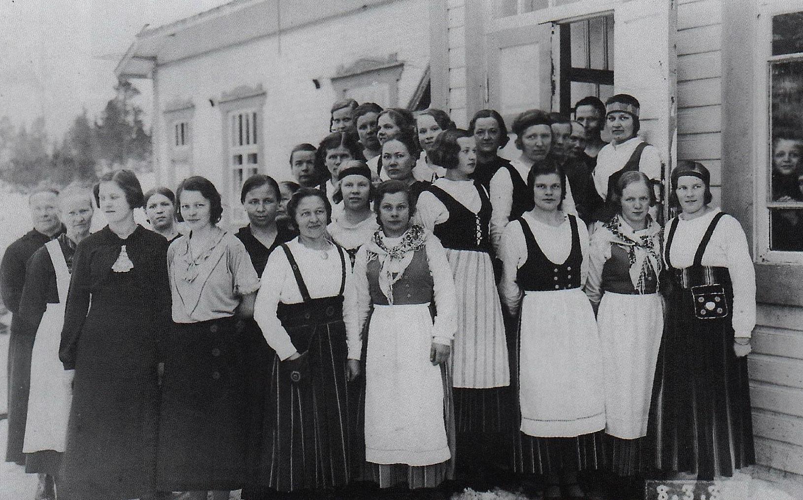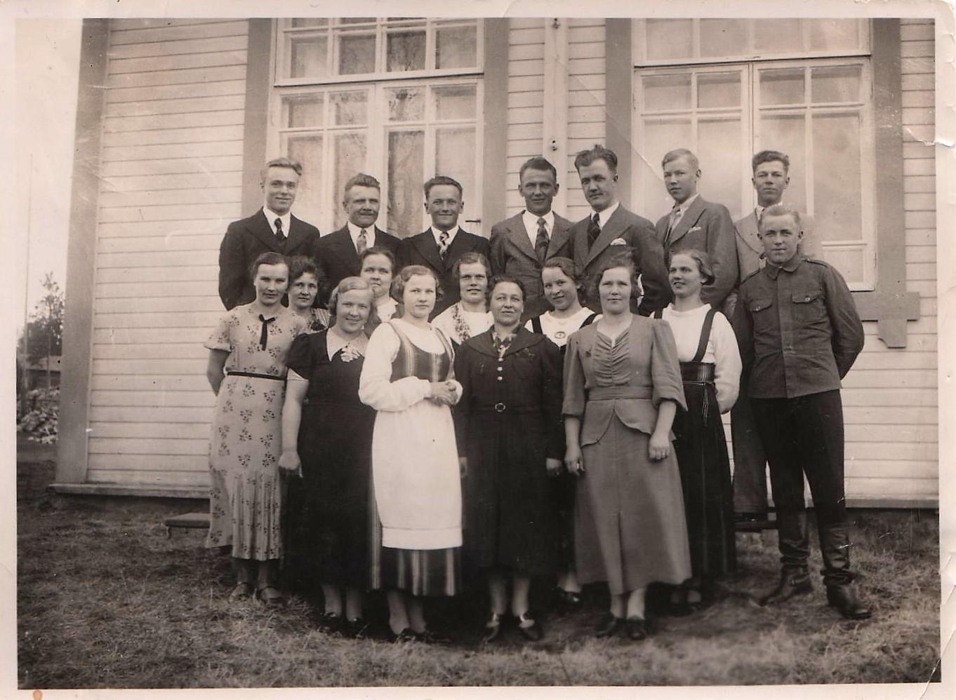 Vahvialan maatalouskerholaisia kirkon portailla. Muutama lottapukukin näkyy jo. Hounin Ahopellon Lyyli Vahvelainen 3. rivi edestä, 6. vasemmalla. Korpelan Aarne Venäläinen eturivissä 2. oikealla. Vahvialan kirkko 5.9.1937 (Oili Aarnialho)