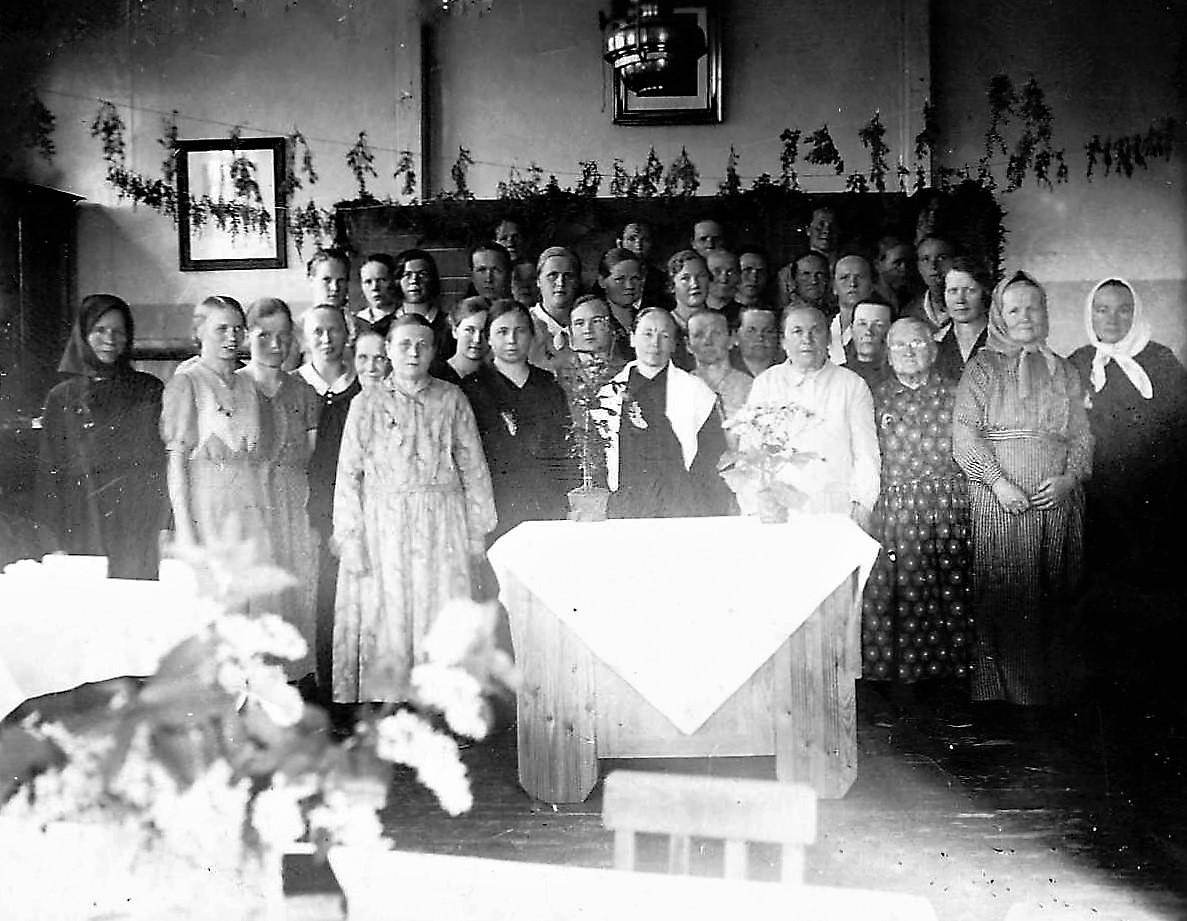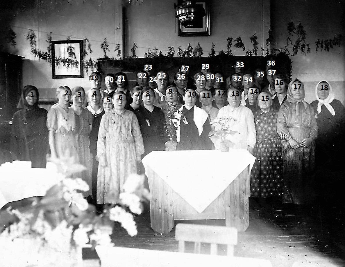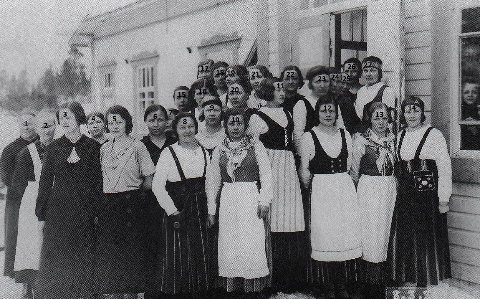 Merimieslähetyksen tms. juhlassa: 2. Kerttu Sahala (14), 4. Lydia Houni (25), 5. Hilda Vahvelainen (18), 7. Aino Venäläinen (26), 8. Lydia Venäläinen (26), 9. Ida Houni (23+ myöh.12), 10. Maria Houni (7), 12. Anna Sahala (14), 15. Maria Virolainen (4), 17. Liisa Houni (25), 18. Maria Räihä (10), 19. Hilja Venäläinen (26), 21. Alina Väänänen (22), 22. Selma Venäläinen (28), 25. Sofia Venäläinen (33), 26. Emmi Räihä (20), 28. Alina "muija" Sipiläinen (21). Houni kansakoulu 1930 - luvun alkupuoli (Oili Aarnialho)