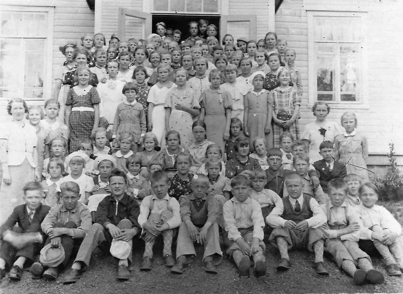 Louon Nuorisoseuran kuoro johtajanaan Eino Mälkki takarivissä 5. vasemmalla. Hounilta edessä vasemmalla 4. ehkä opettaja Vieno Lötjönen, 5. Mäkelän Sylvi Räihä, 6. Koivulan Laila Houni, 8. Sylvi Kotonen ja 10. Sikosaaren Aune Houni. Takarivissä vasemmalla Ylätuvan Oiva Väänänen. Hounin kansakoulu 1935 (Markku Houni)