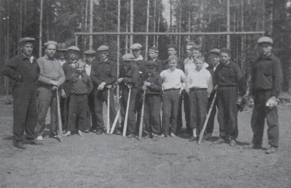 Hounin kankaalle talkoilla rakennetulla urheilukentällä pelattiin innokkaasti mm. pesäpalloa. Vas. Kalle Räihä (11), 2 tuntematonta, Toivo Venäläinen(28), Väinö Väänänen (22), Viljo Houni (1), Tauno Räihä (3), edessä ?, Unto Messo (2), Leo Houni (1), Viljo Räihä (10), ?, Toivo Houni (25), Eino Venäläinen (27), ?, Ale Haarus (31) ja Tauno Myyrä (15). Houni urheilukenttä 1930 -luvun lopulla (Eloistamme entisistä 2005)