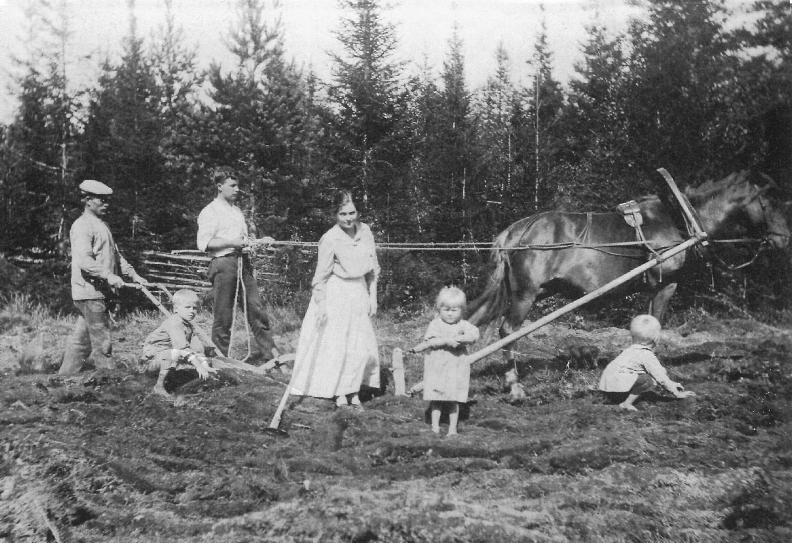Sahalan talon (25) perunamaata kynnetään. Auran sarvissa Edvard Sahala, ohjaksissa Hugo Palolehto, kuokan varressa Irene Palolehto ja mukana myös lapset (vas) Edvard, Jenny ja Martti. (Martta Sahala)