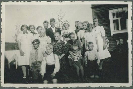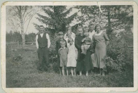 Eelin ja Edvardin sukulaisia ja häävieraita. Edessä Eino solmio kaulassaan, mummon sylissä istuu Kauko ja hänen oikealla puolellaan Pentti. Oripää 1941 (Eeva Immonen)