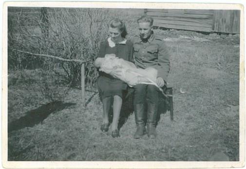 Vilhon ja Anjan ensimmäinen lapsi Heikki 1944-1960 syntyi Tervajärvellä. Nuori perhe kuvattuna Lahtelan pihassa. Lahtela toukokuu 1944 (Eeva Immonen)